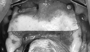 Perform the procedures of site preparation to membrane fixation, autologous bone harvesting, layered graft placement and suture closure
